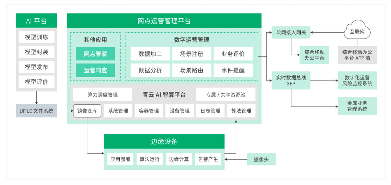 该银行采用青云 AI 智算平台,利用云原生调度架构结合边缘计算框架,构建总分一体化云边协同体系。该方案以分支机构为组织单元,以边缘节点为单位,实现统一管理、统一调度、统一监控,从而达成云边协同,并显著提升边缘计算效率。